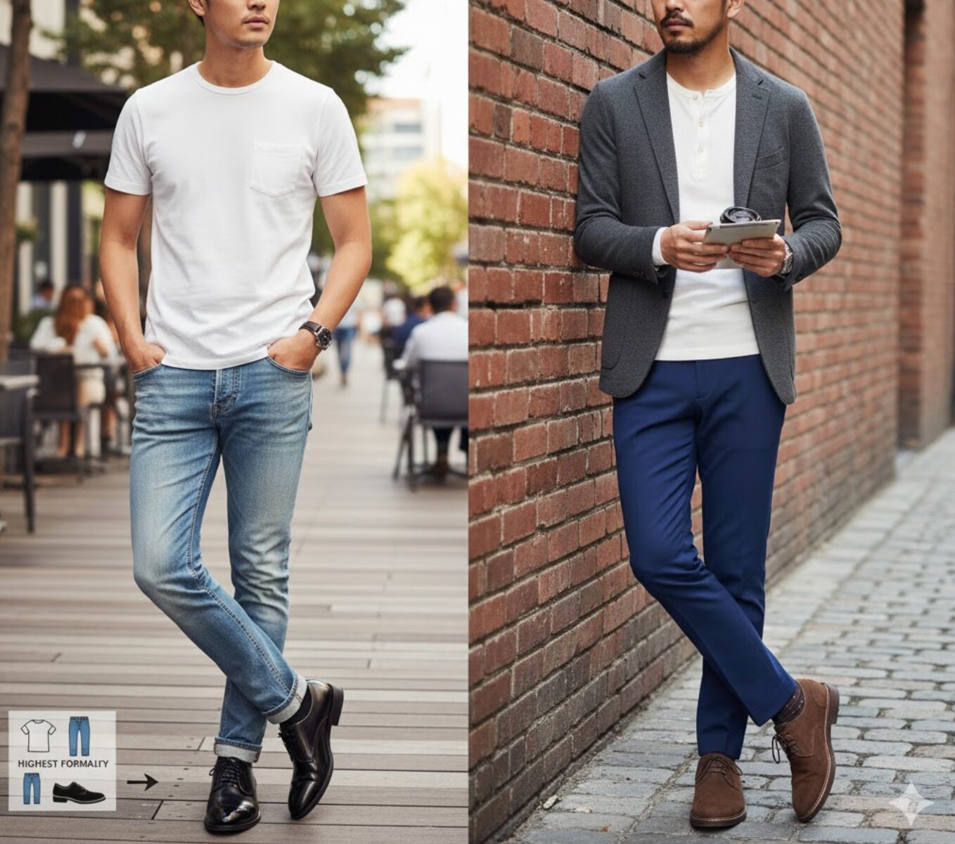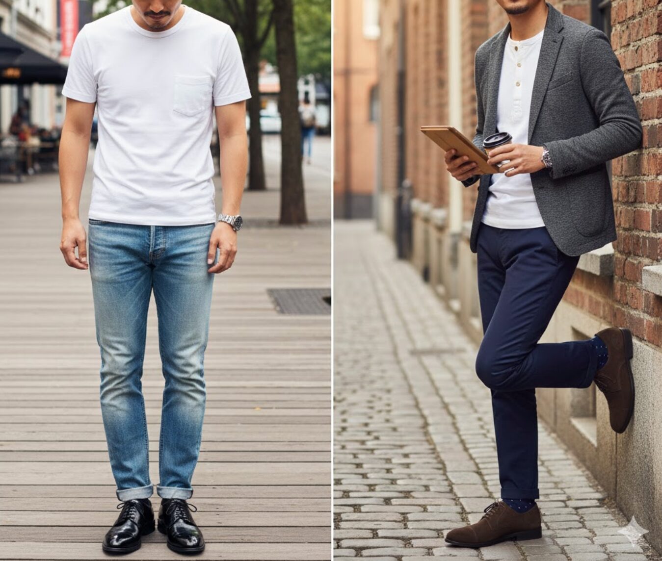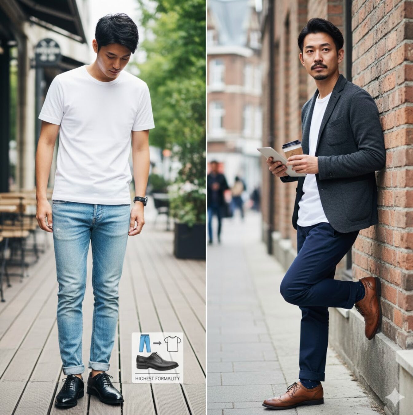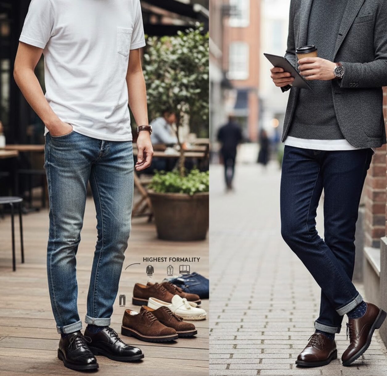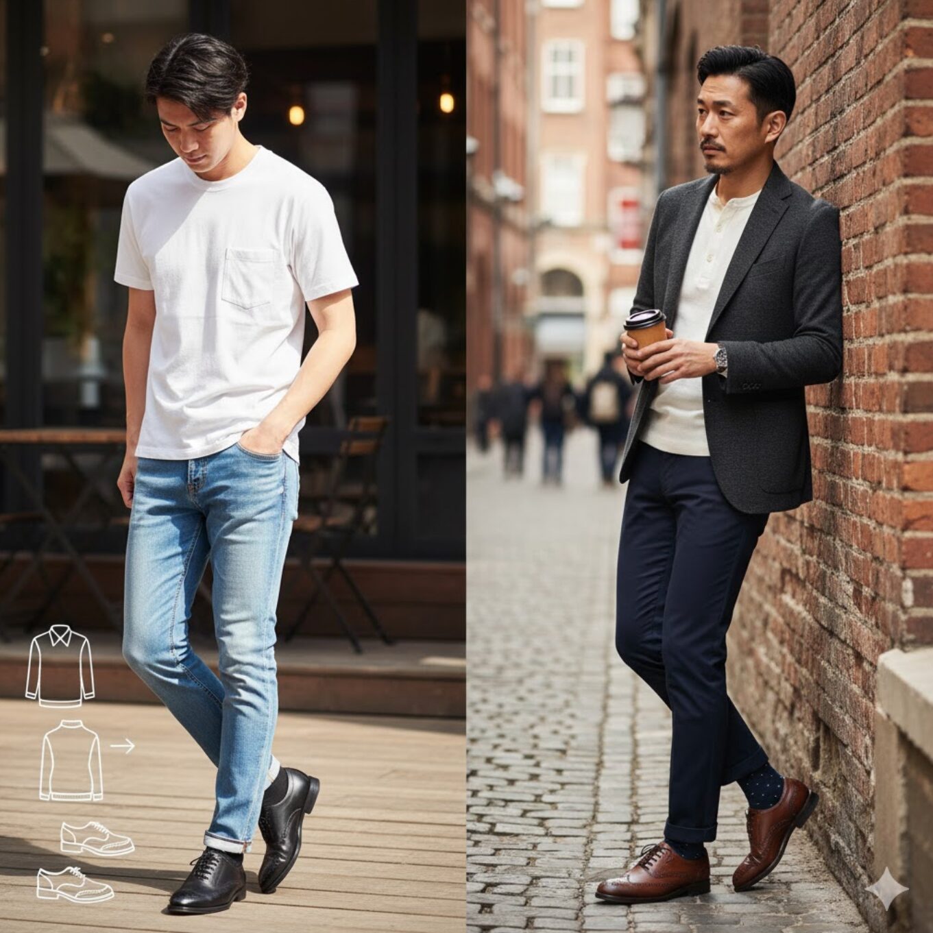 一方で、最も避けるべき組み合わせの典型が、「黒の内羽根式ストレートチップ」と「色落ちしたカジュアルなデニム」の組み合わせです。これは服装の専門家からも「ナンセンス(無意味)」とまで評されることがあるほど、双方の持つ特性がかけ離れています。