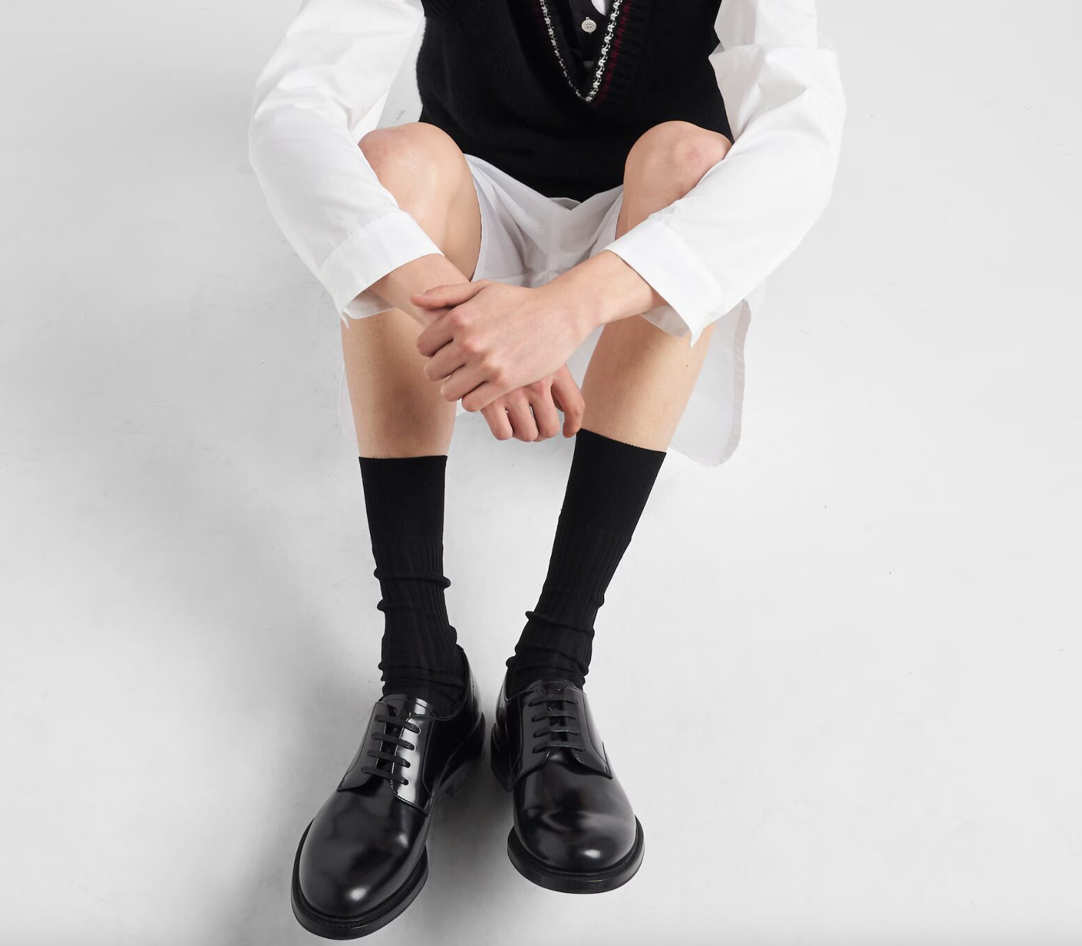 職場のドレスコードにもよりますが、最もフォーマルな黒の内羽根式ストレートチップは、ノーネクタイのシャツスタイルやニットウェアには少し堅苦しく、過剰に映る可能性があります。