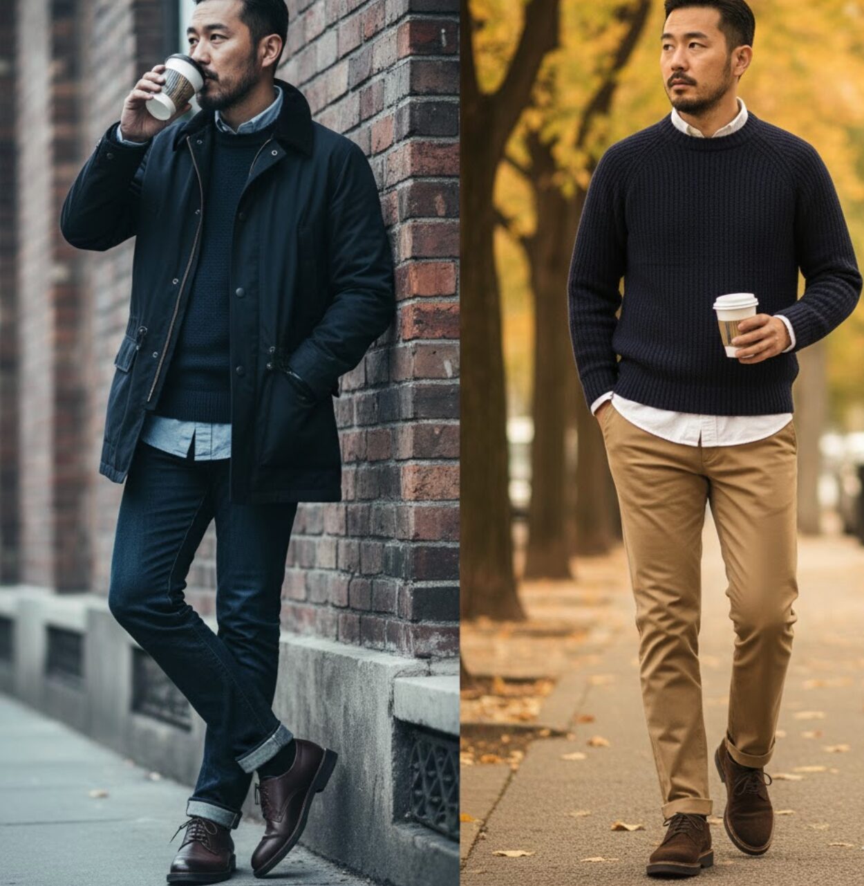 - トップス:ニットウェア(クルーネックセーター、カーディガン、タートルネックなど)は、カジュアルとスマートの橋渡し役として非常に優秀なアイテムです。