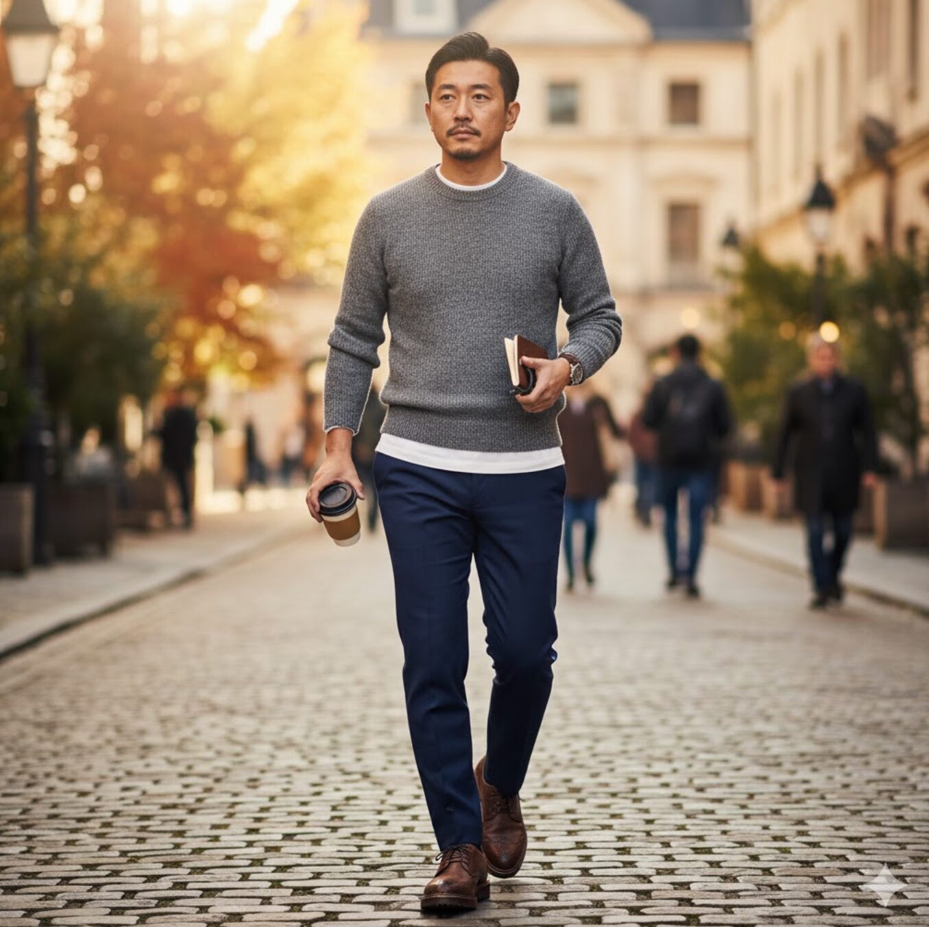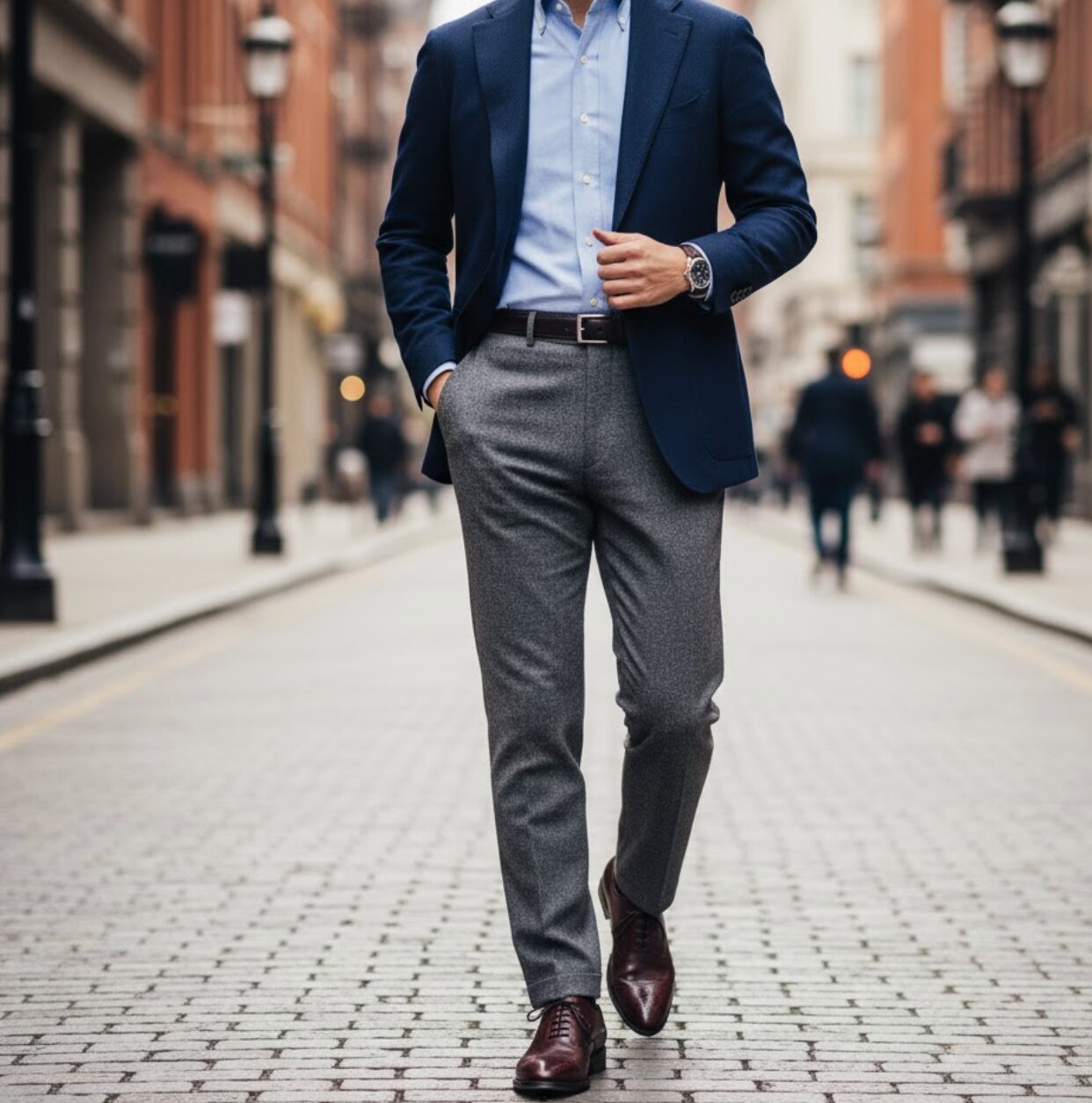 例えば、秋冬であれば、ネイビーのブレザーにグレーのフランネルパンツを合わせ、足元にバーガンディのストレートチップを持ってくると、知的で季節感のある大人のスタイルが完成します。