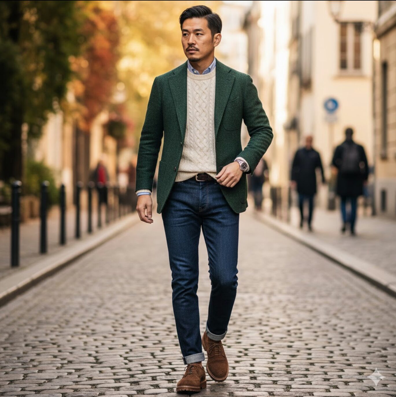 そして、合わせる靴も厳選しなければなりません。この場合、内羽根式ではなく「外羽根式」で、色はブラウン系、素材はスエードやシボ革、つま先は丸みを帯びたものを選ぶのが最適解です。特にスエード素材の柔らかい質感が、デニムのカジュアルな雰囲気と非常に自然に調和してくれます。