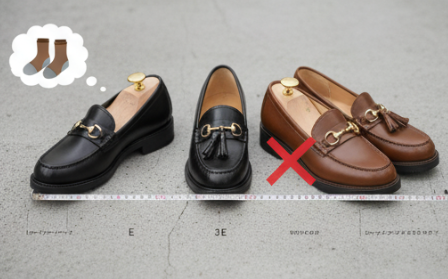 一般的に、日本人にはEから3Eのワイズを持つ人が多いとされており、市販のローファーもこの範囲のものが多く見られます。