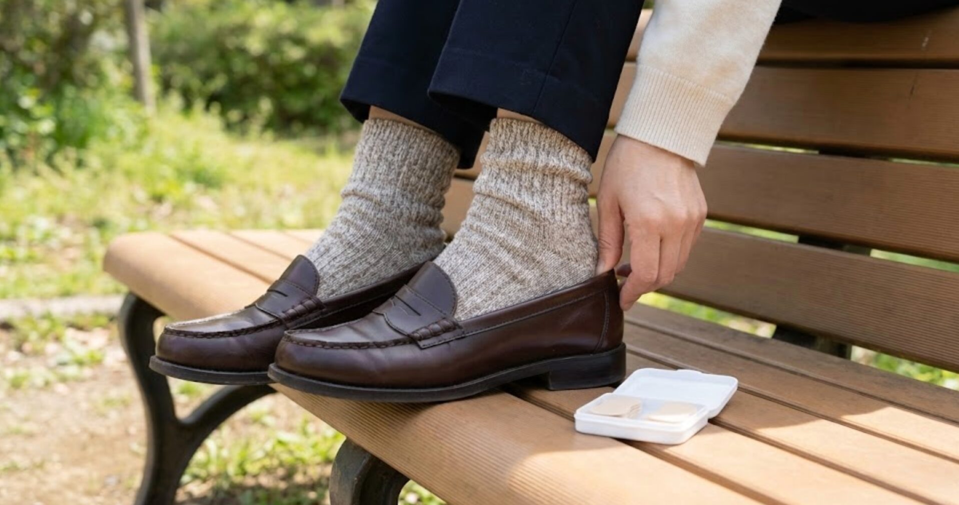 | 着用初期 | 普通のビジネスソックスではなく、厚手のスポーツソックスやウールソックスを着用する。厚みでクッション性を持たせ、靴との隙間を埋めます。 |