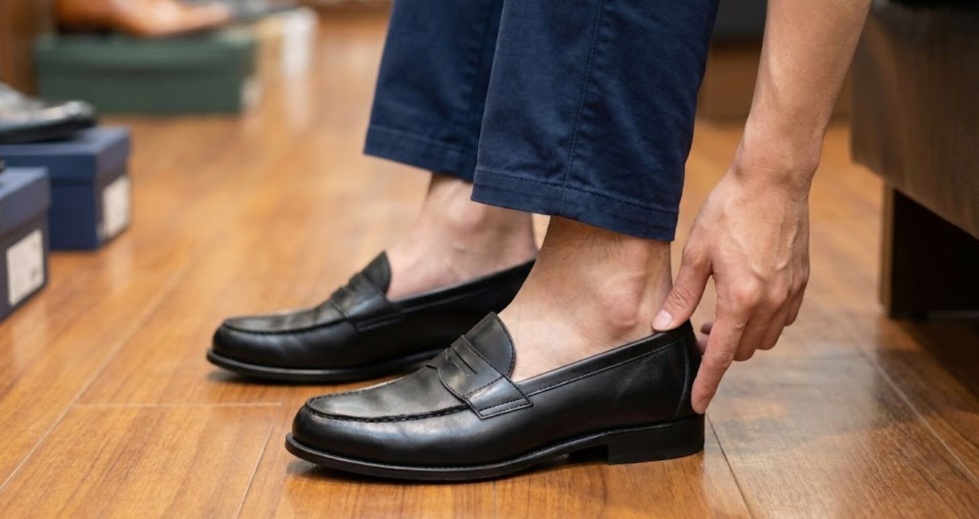 ローファーは紐で締め上げることができないため、「甲の押さえ」と「踵(かかと)の引っかかり」だけで足を固定します。もし幅が広すぎる4Eを選んでしまうと、足が靴の中で前滑りしてしまい、結果としてつま先が靴の先端に当たって痛くなるという逆転現象が起きます。