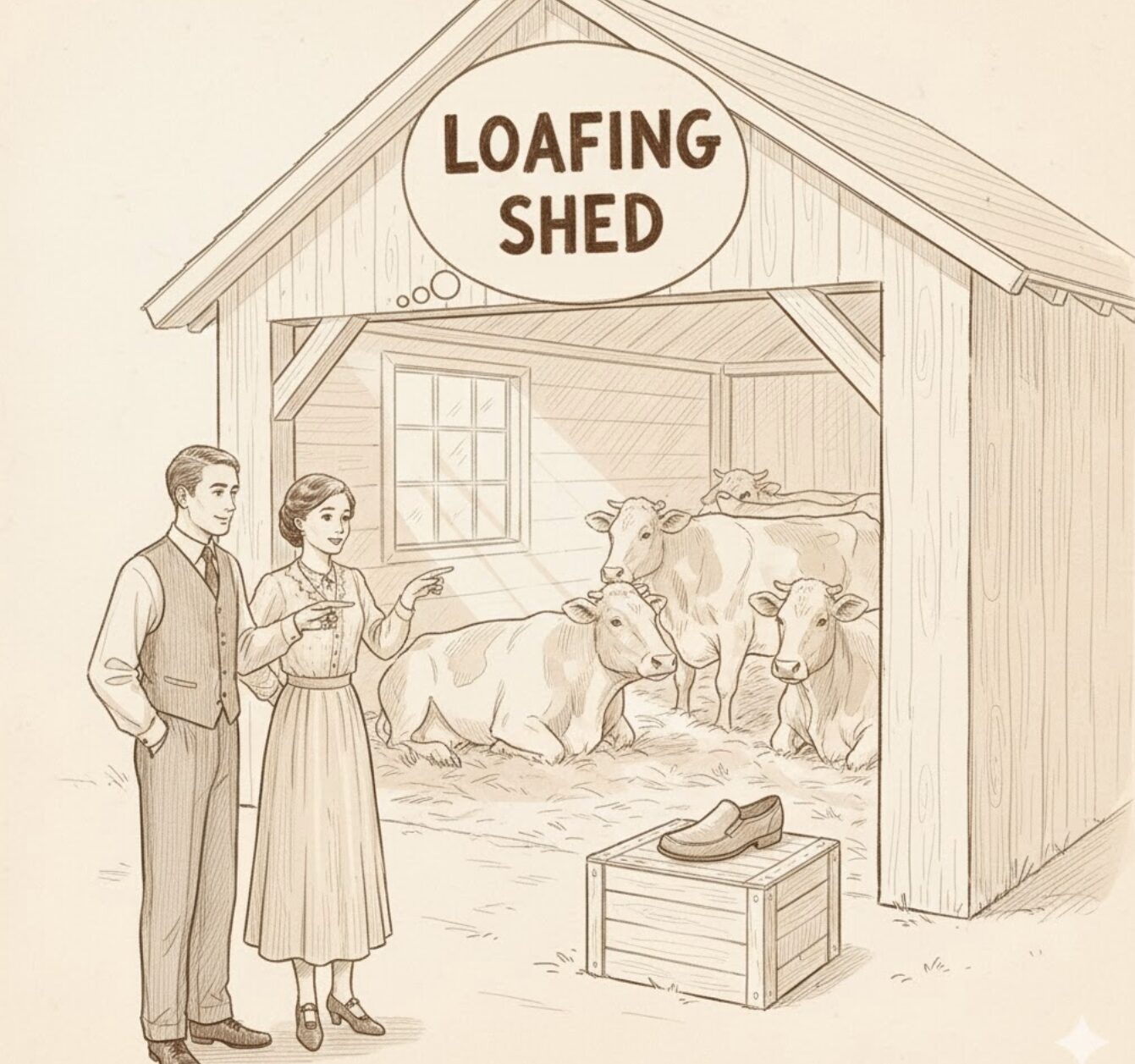 「Loafing Sheds」というのは、牛たちが搾乳の前にリラックスして待機(loaf)するための場所のこと。なんとも長閑な光景が目に浮かびますね。