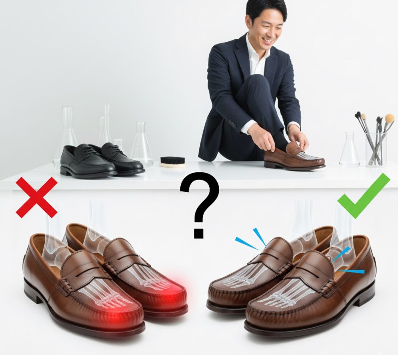 これは、紐で固定できないローファーの構造上、ホールド感を確保するために重要な考え方です。しかし、「きつい」にも良いキツさと危険なキツさがあります。