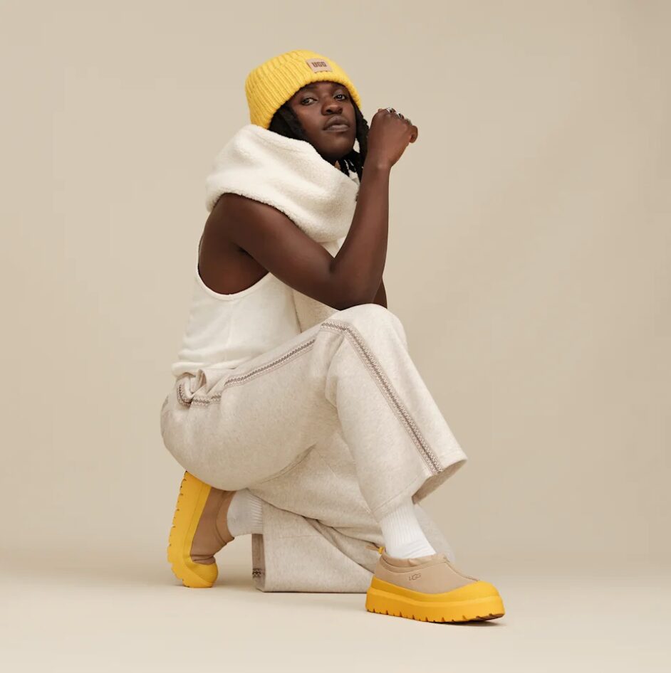 最も象徴的なのが「Tazz」スリッポンや「Ultra Mini」ブーツです。これらは、アグのクラシックなデザインDNA(シープスキン、丸みのあるトゥ)を踏襲しつつも、シルエットやディテールを現代風に大胆にアップデートしています。