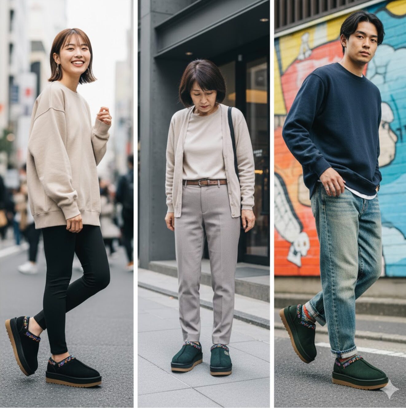 • 具体的なコーデ例:柔らかな素材のティアードワンピースや、揺れ感のあるプリーツスカートなど、甘くなりがちなアイテムの足元にアグのスリッポンを選びます。