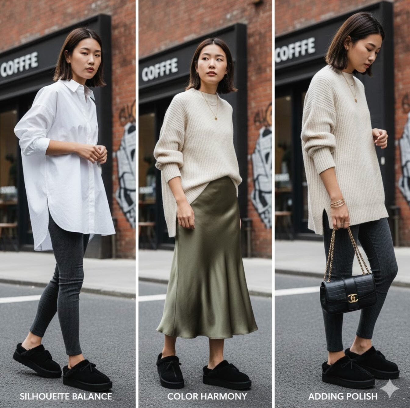 • 具体的なコーデ例:センタープレスの入ったスラックスや、光沢感のあるサテンのナロースカートに、あえてアグのスリッポンを合わせます。